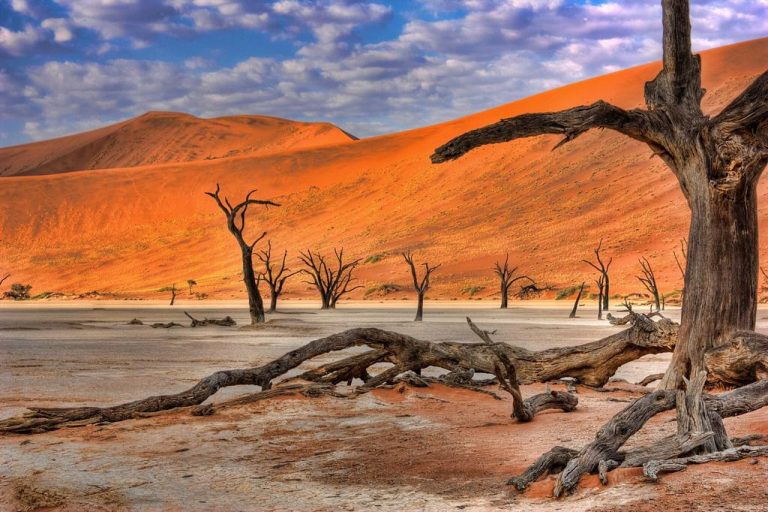 Découverte des dunes rouges du désert du Namib. Randonnée de 3 heures à la découverte de Deadvlei et de la dune Big Daddy, dite la plus haute dune du monde. Camp de bivouac. Hébergement : Camping